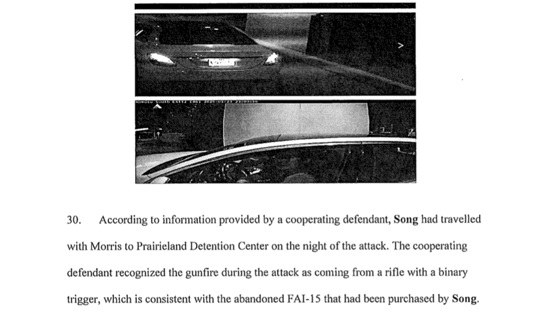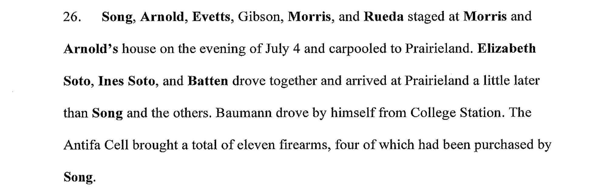 According to the Texas Observer, "Sikes, who has pleaded guilty to providing material support to terrorists, told prosecutors that the role of Song, the alleged shooter, was to use his rifle to intimidate law enforcement so that the protesters could escape." In the Stipulated Facts for Baumann and Gibson, who also pleaded guilty to providing material support to terrorists, both defendants established Song’s role was to alert protesters if police arrived.