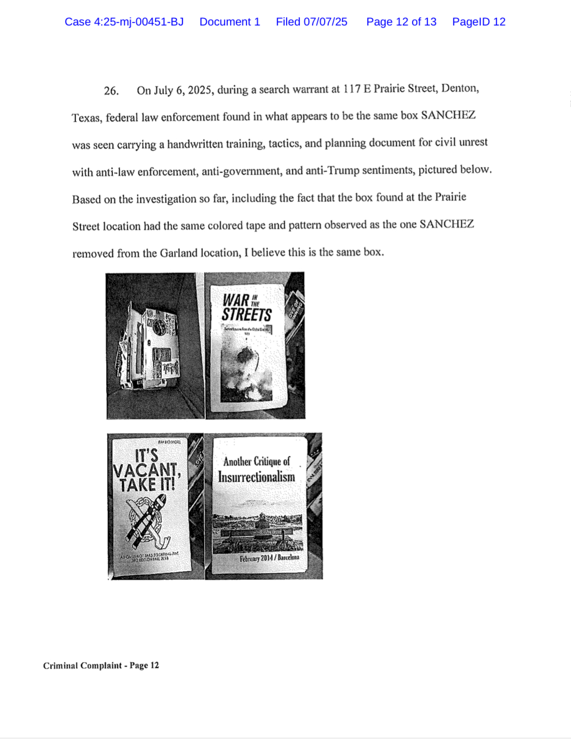 While also including references to other codefendants and their role in relation to the case, the above referenced criminal complaint was specifically submitted to the court to establish probable cause in the arrest of Daniel “Des” Rolando Sanchez-Estrada. The feds are alleging that him and his partner committed a conspiracy to destroy documents in the investigation when he moved a box of zines out of his partner’s car and into an apartment in Denton, Texas.