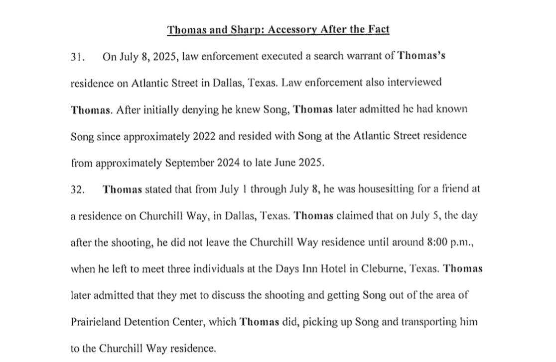 In the federal government’s criminal complaint for Sharp and Thomas, Thomas was one codefendant who provided an interview about Song to federal agents.