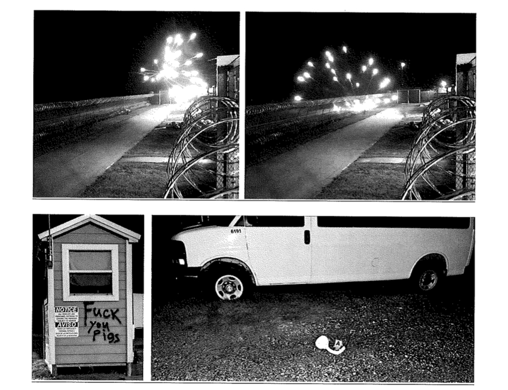 During the demonstration, court documents allege that a guard shed, multiple officer vehicles, and other facility property were spray painted while fireworks were set off.